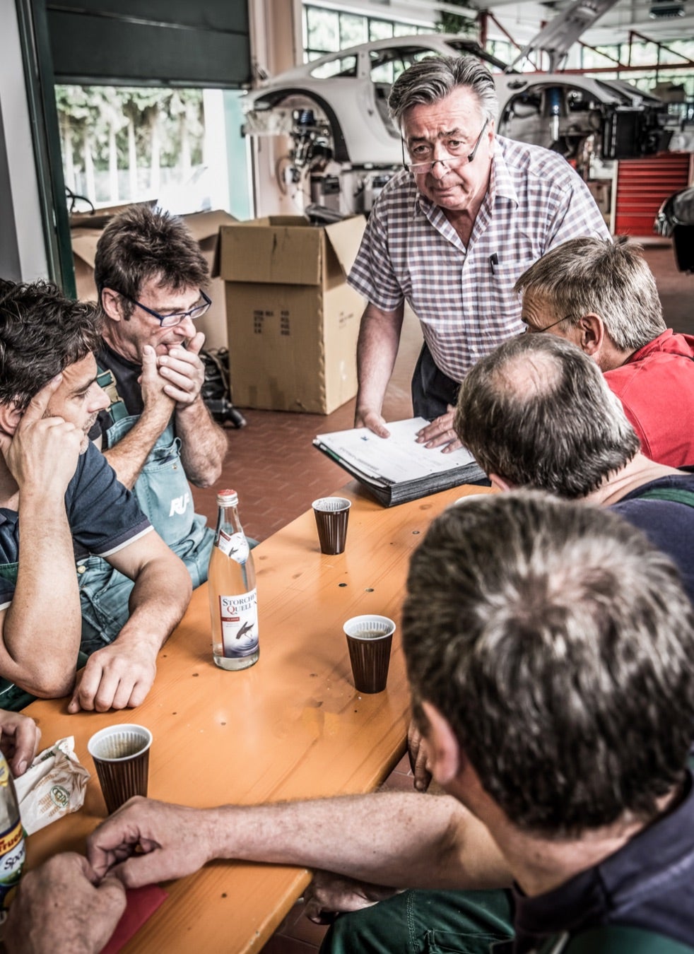 RUF allows its lucky owners to personalize their cars in the most detailed of ways. Alois Ruf, upper right, talks to his staff. His father founded the company in 1939, which began as a gas station. Below, a paint technician at work in the RUF factory. There are 800,000 colors to choose from